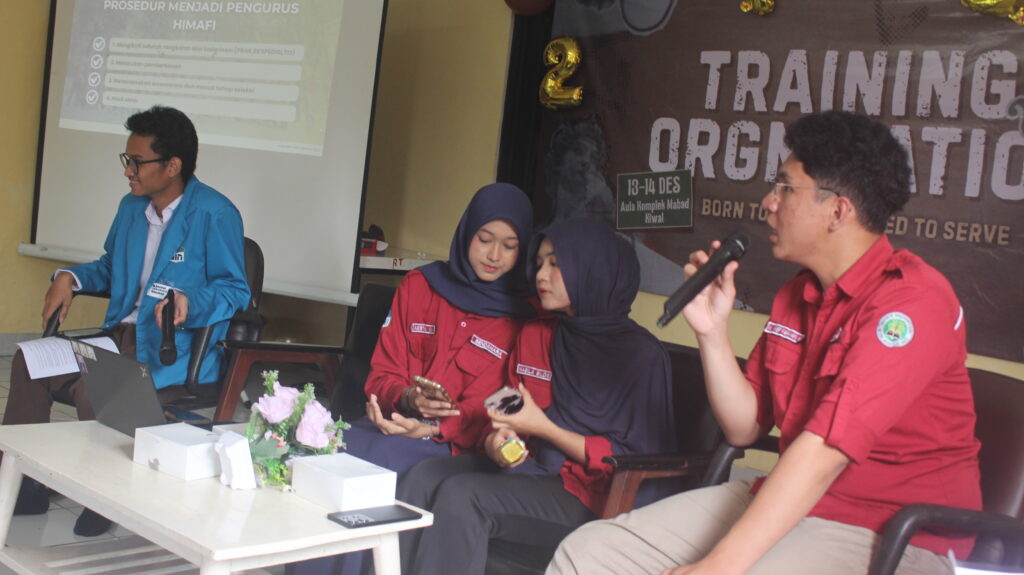 Departemen Pengembangan Sumber Daya Mahasiswa Himpunan Mahasiswa. Fisika (HIMAFI) UIN Syarif Hidayatullah Jakarta telah melaksanakan kegiatan Training Organization 2025 yang berlangsung pada Sabtu, 13 Desember 2025 dan Minggu, 14 Desember 2025. Kegiatan ini mengusung tema “Developing Organizational Mindset for Future Leaders” dengan tujuan membentuk karakter mahasiswa agar mampu memahami serta mempersiapkan diri untuk terlibat aktif dalam dunia keorganisasian. Kegiatan ini dikemas dalam bentuk pelatihan yang berfokus pada pengenalan sistem keorganisasian di Program Studi Fisika UIN Syarif Hidayatullah Jakarta, sekaligus meningkatkan kemampuan soft skill dan hard skill peserta yang tidak diperoleh secara langsung melalui perkuliahan. Pelaksanaan Training Organization 2025 berlangsung selama dua hari dan di tempat yang berbeda. Hari pertama dilaksanakan di Aula Komplek Mabad Kiwal dan hari kedua di Lobby Pascasarjana FEB UIN Syarif Hidayatullah jakarta.