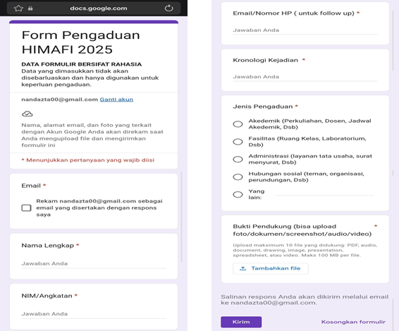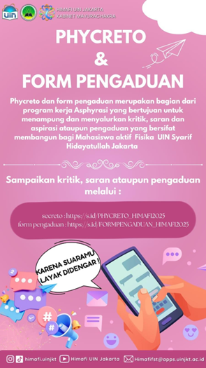 “PHYCRETO dan GOOGLE FORM” adalah media untuk menyampaikan aspirasi, kritik, dan saran mengenai HIMAFI, Prodi, maupun Fakultas dari mahasiswa/i aktif Jurusan Fisika UIN Jakarta. Media online yang digunakan untuk menampung menan aspirasi tersebut adalah platform Secreto dan Google Form, dimana partisipan dapat mengirimkan pesan secara anonim, yang kemudian disebar dengan berupa link melalui grup 4 angkatan mahasiswa aktif dan Instastory HIMAFI. Proses pengumpulan dengan metode ini dilaksanakan setiap bulannya pada minggu ke-1 dan ke-3 mulai dari bulan Mei 2025 hingga Januari 2026.